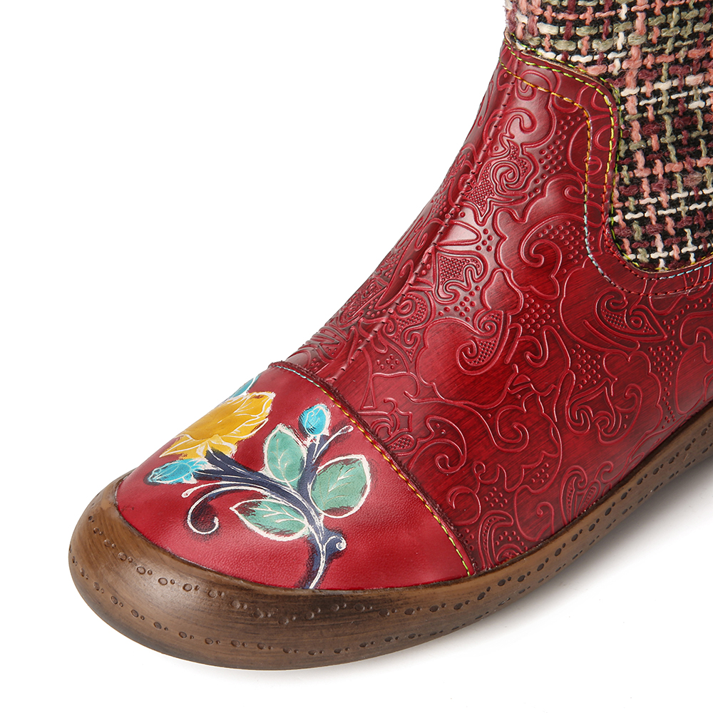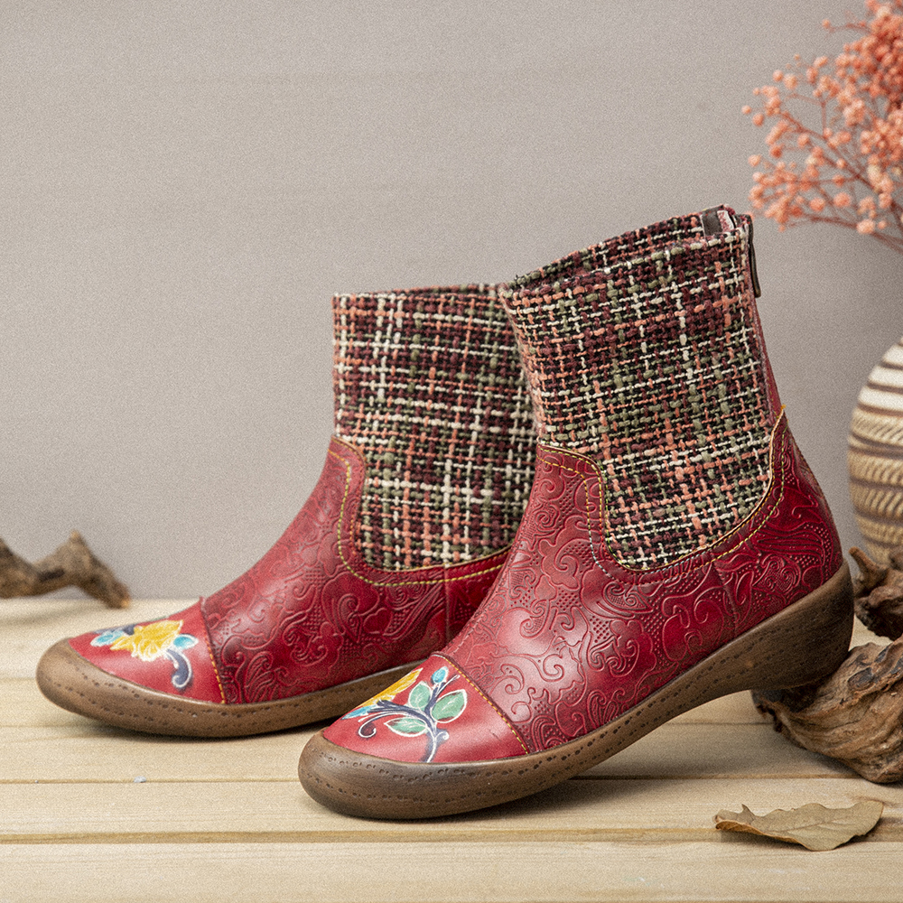 Check Woolen Splicing Floral Embossed Genuine Leather Flat Short Boots