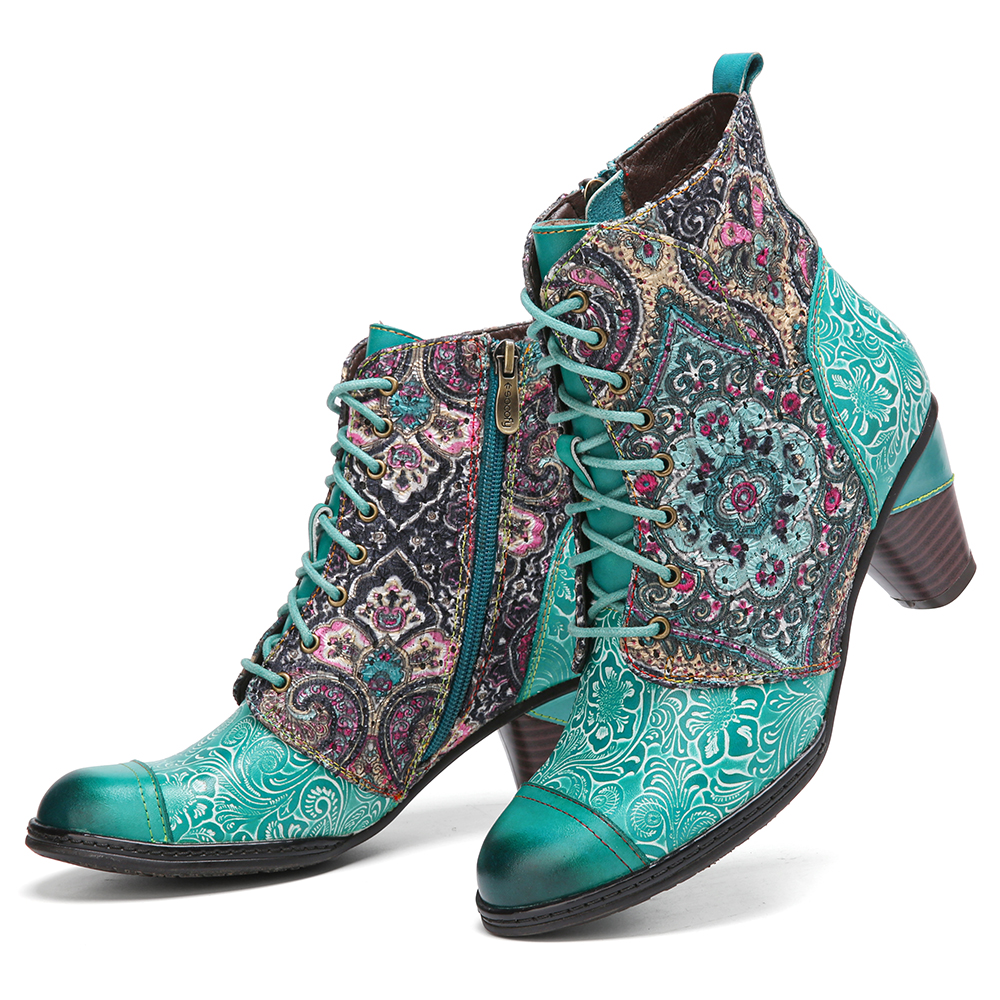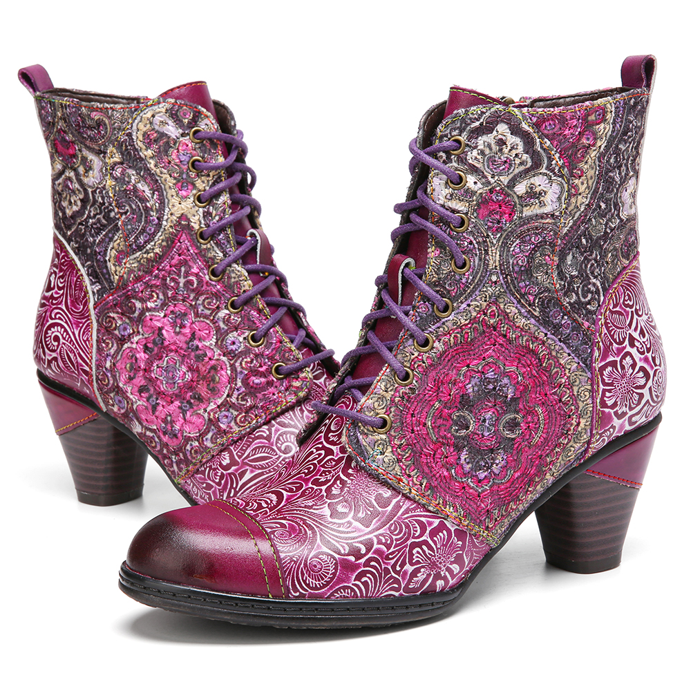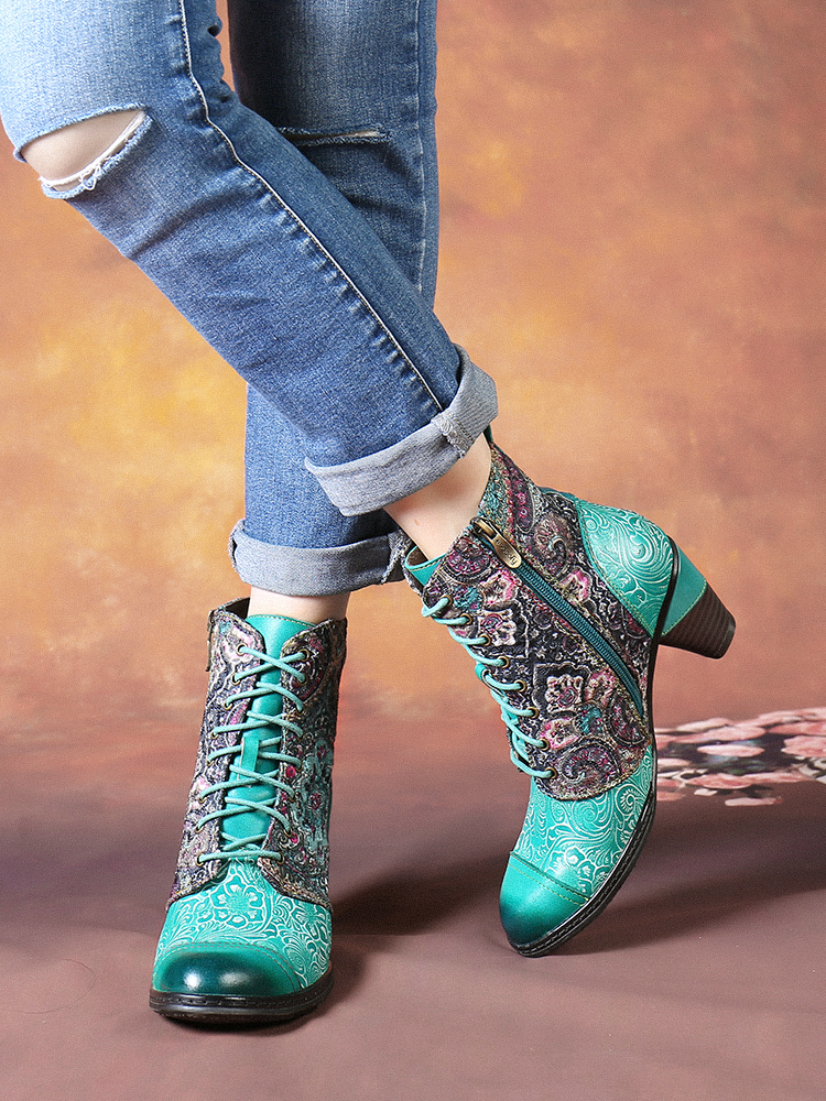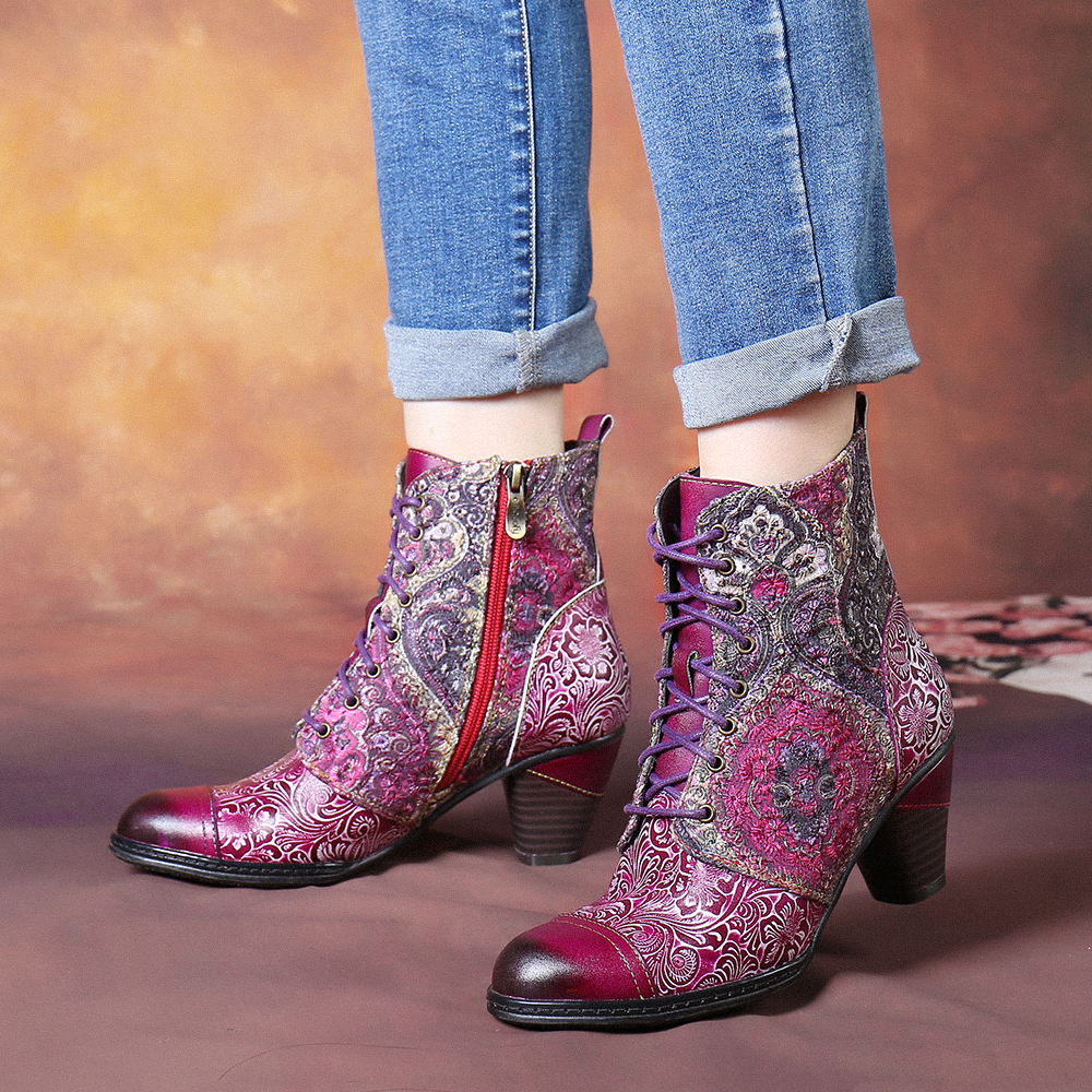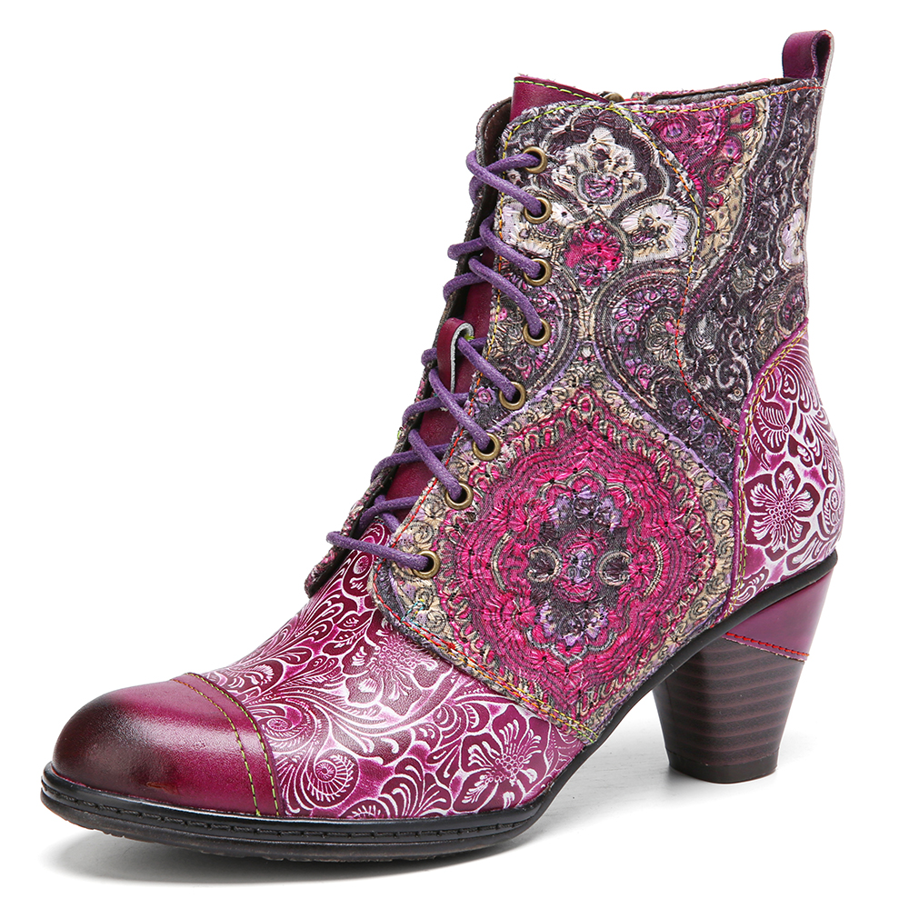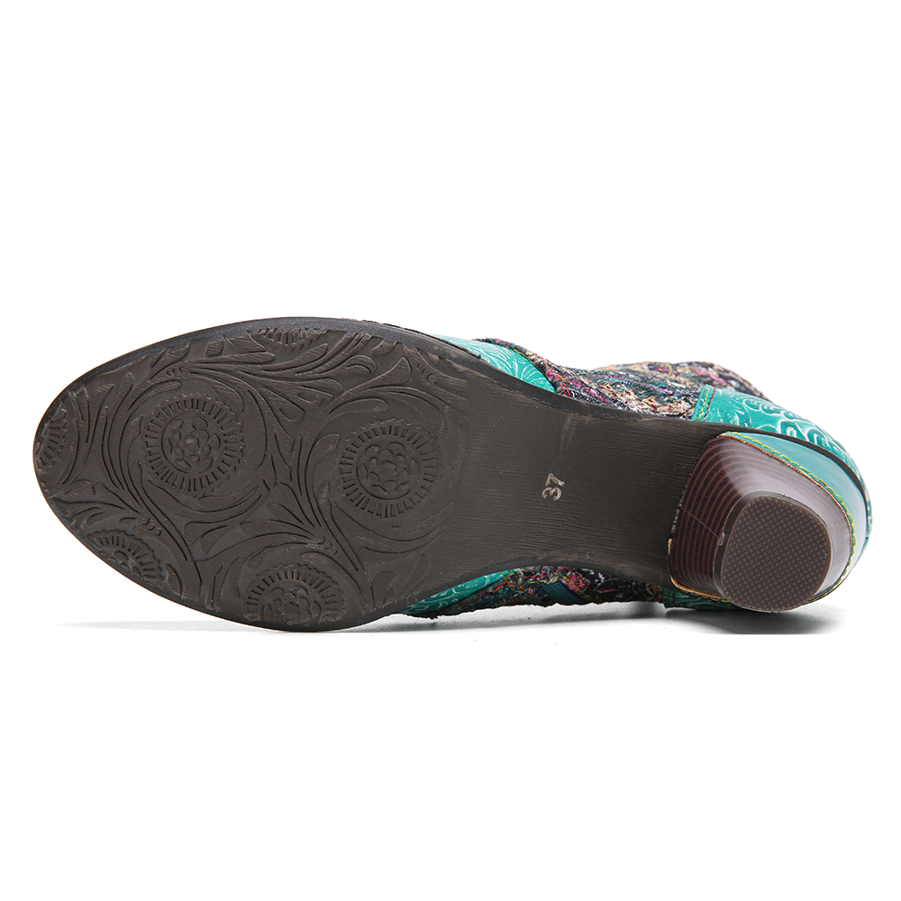Socofy Genuine Leather Floral Pattern Retro Mid-calf Boots