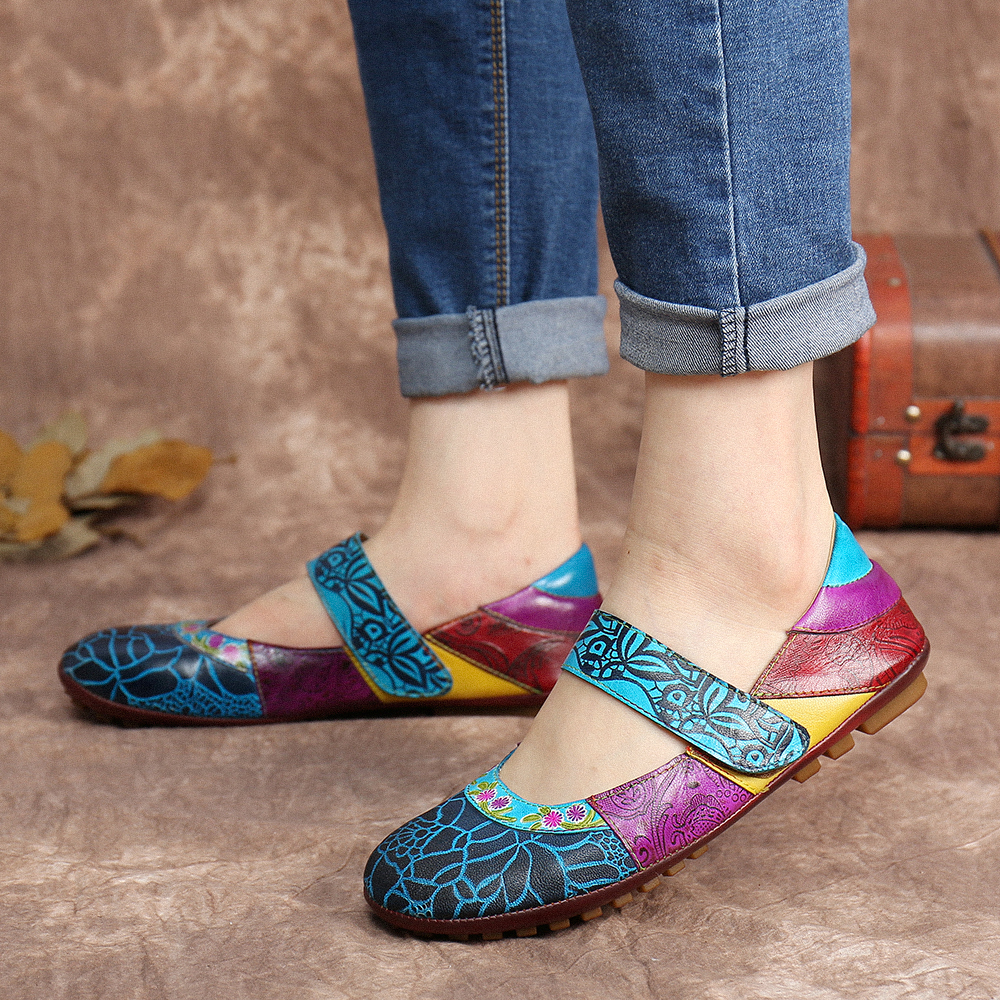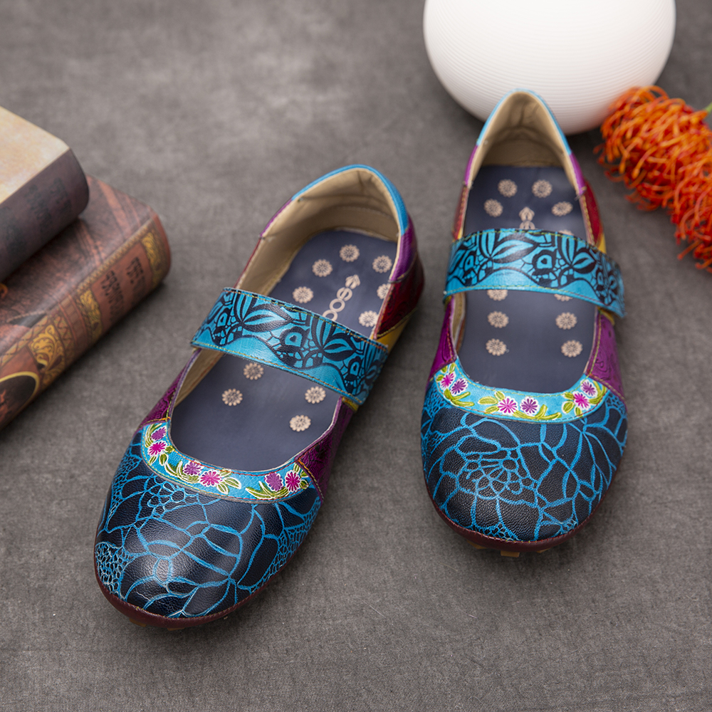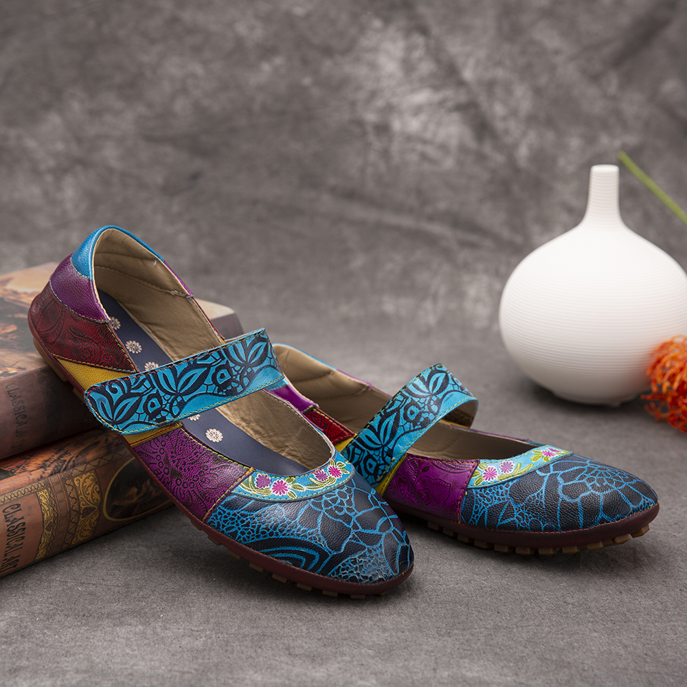 Retro Leather Splicing Floral Soft Sole Hook Loop Ankle Strap Flat Shoes