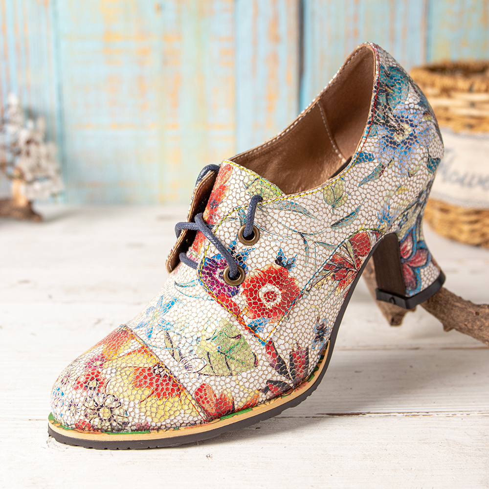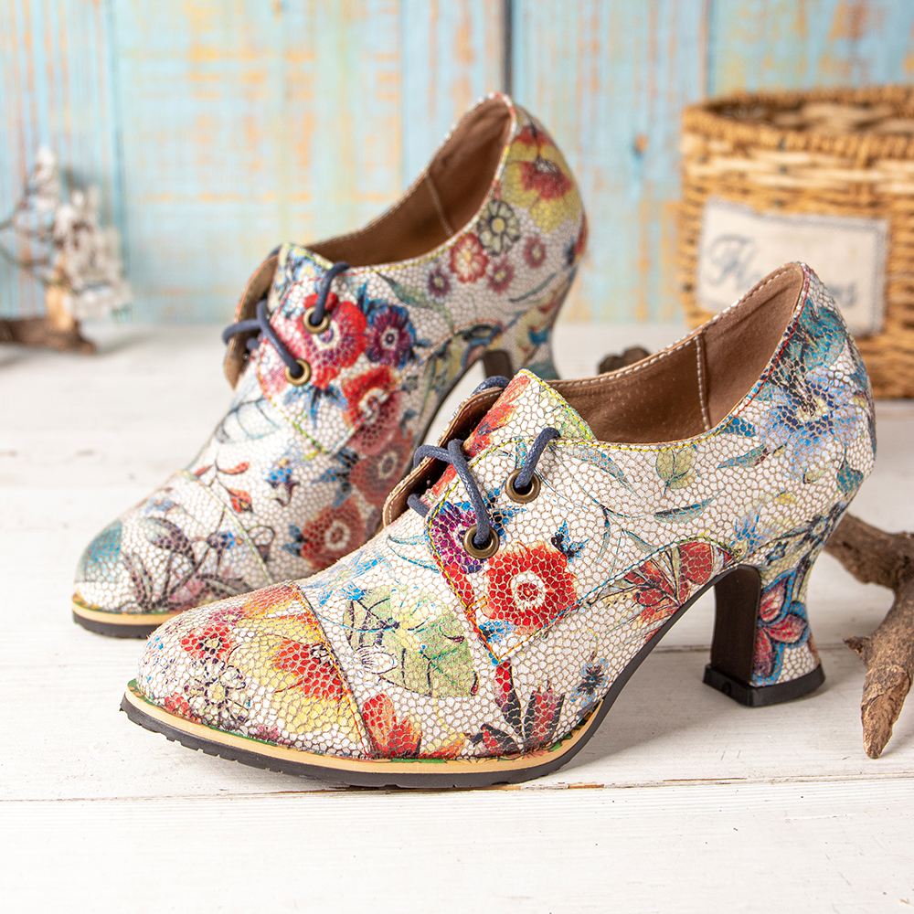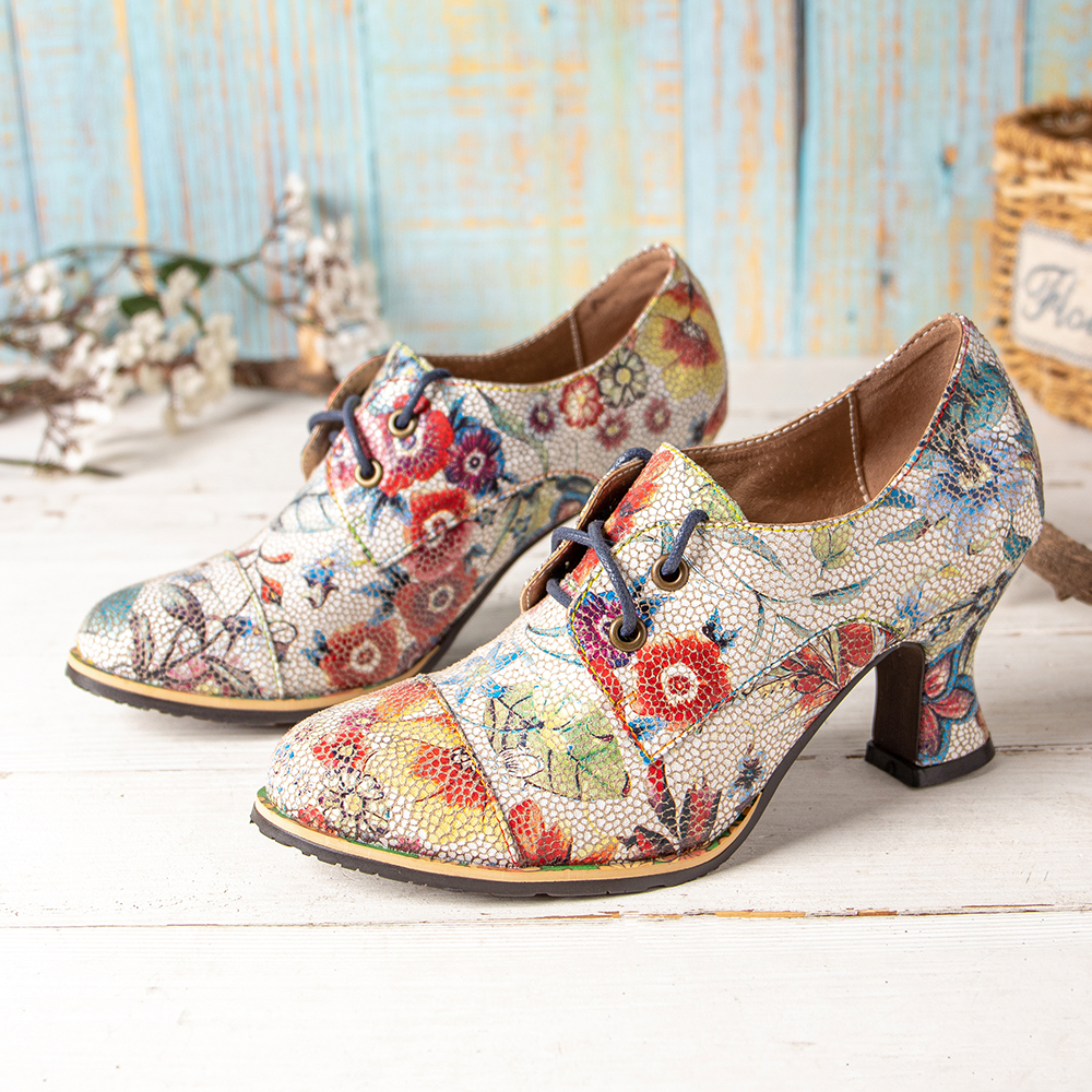 Fresh Natural Flowers Leaves Printed Comfy Wearable Chunky Heel Women Casual Lace Up Pumps