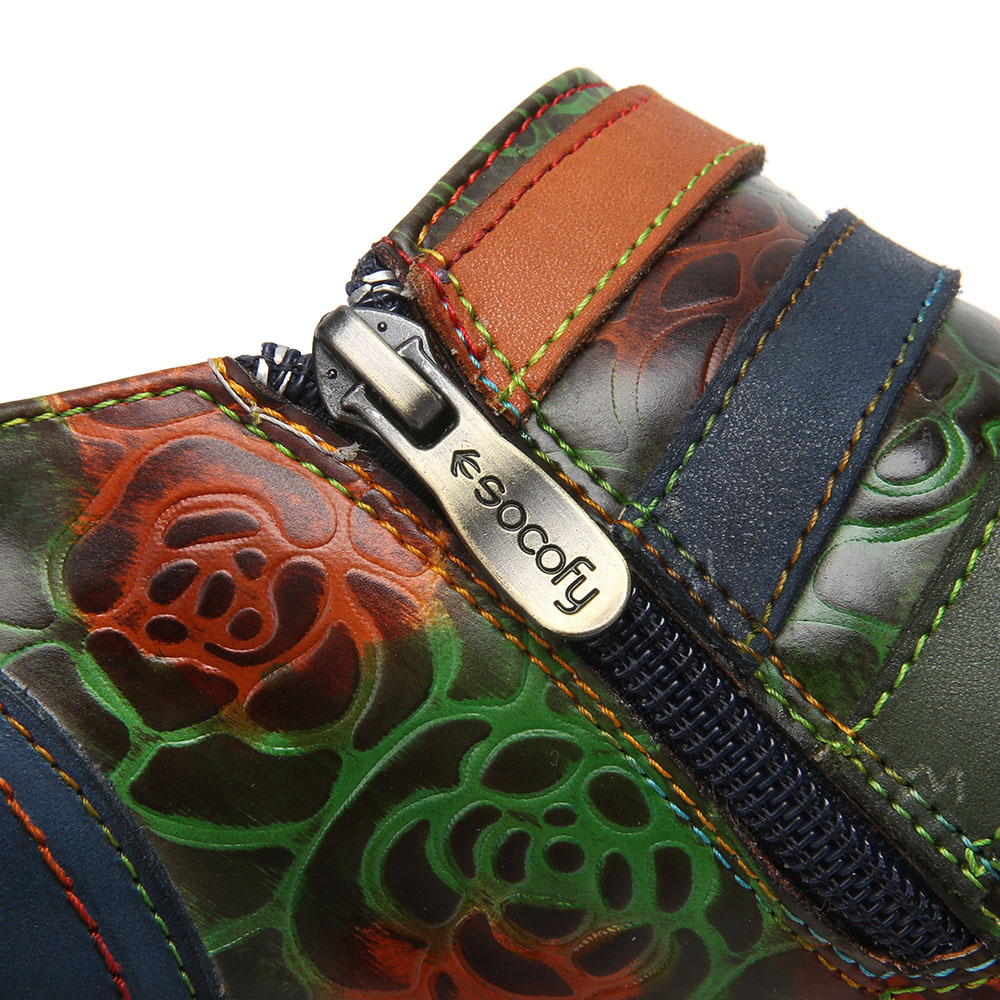 Genuine Leather Comfy Side-zip Retro Belt Buckle Decor Floral Heels