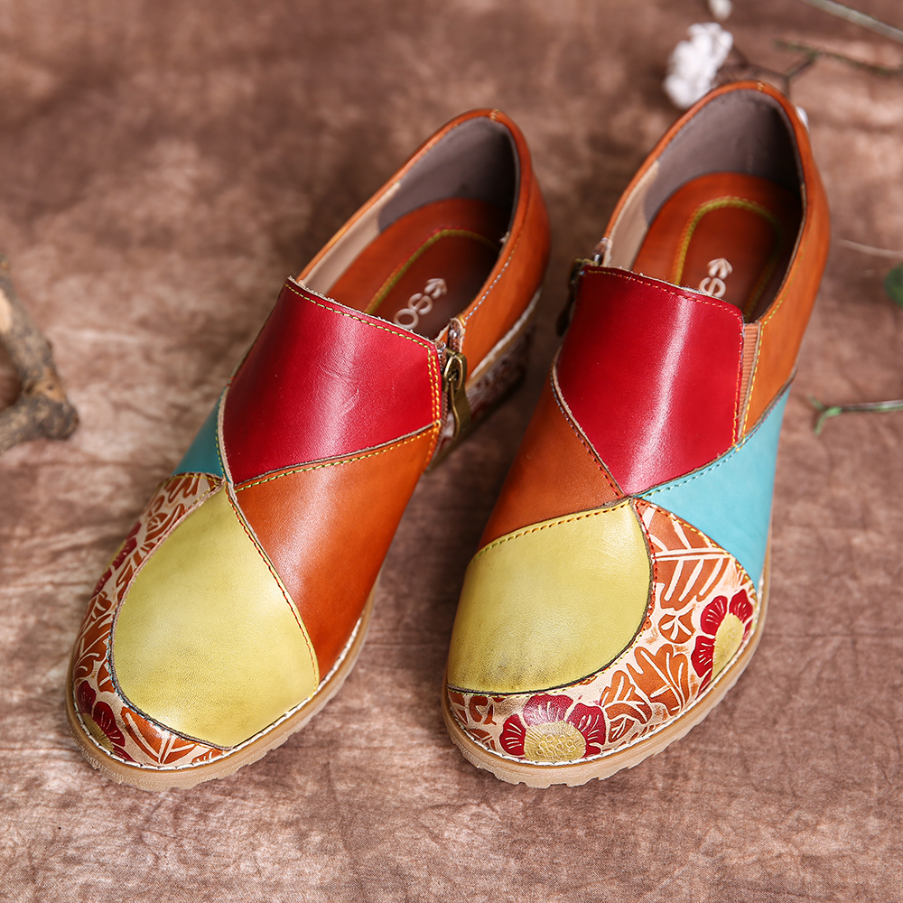 Retro Contrast Splicing Leather Zipper Low Heel Ankle Boots Slip On Block Heel Pumps