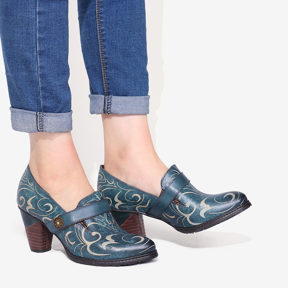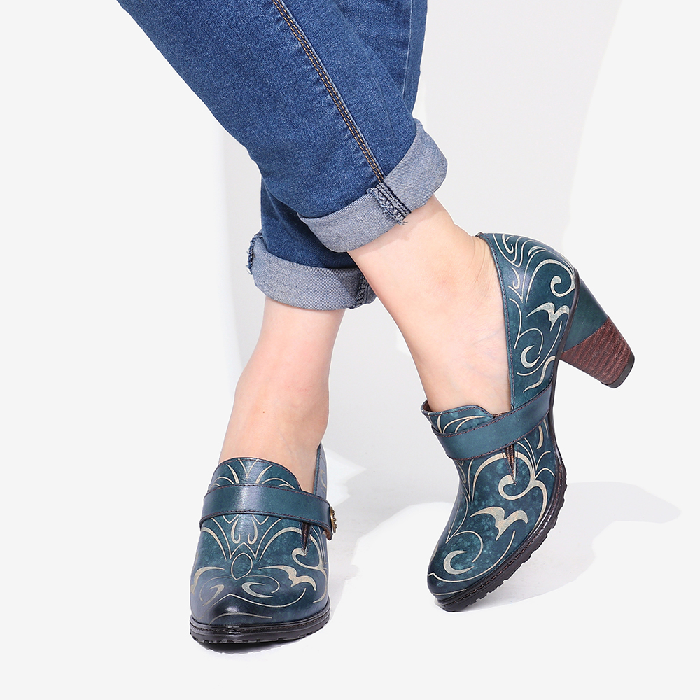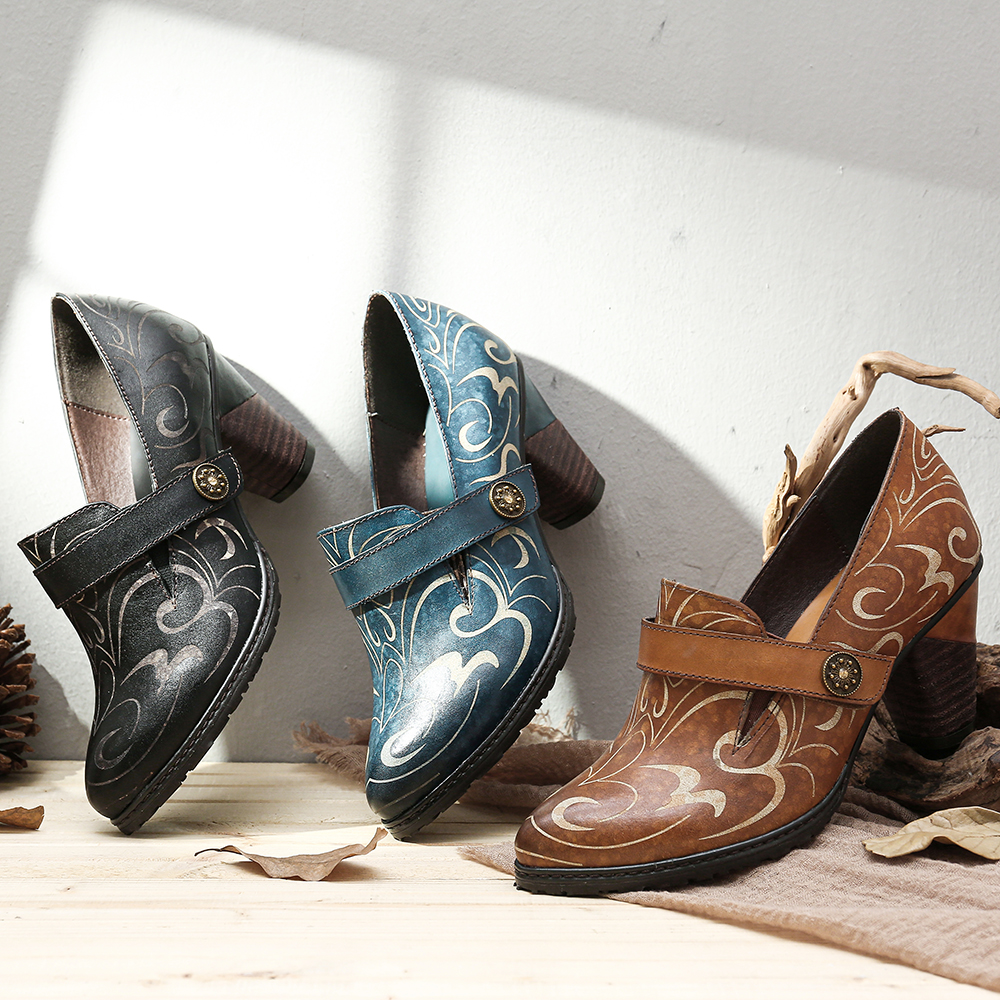 Retro Genuine Leather Vine Pattern Solid Color Elegant Hook Loop Pumps