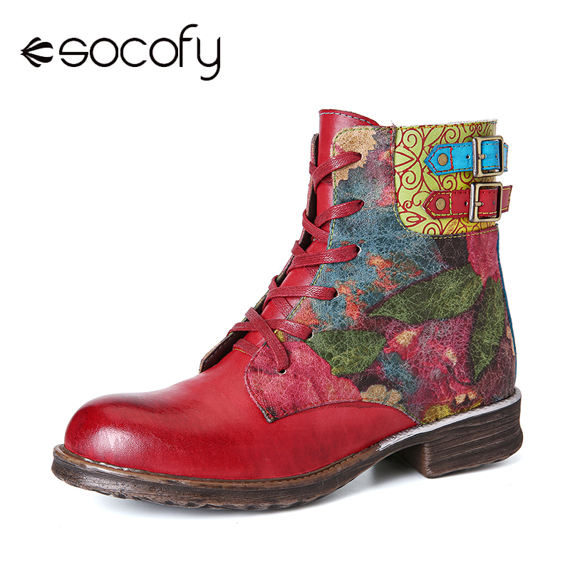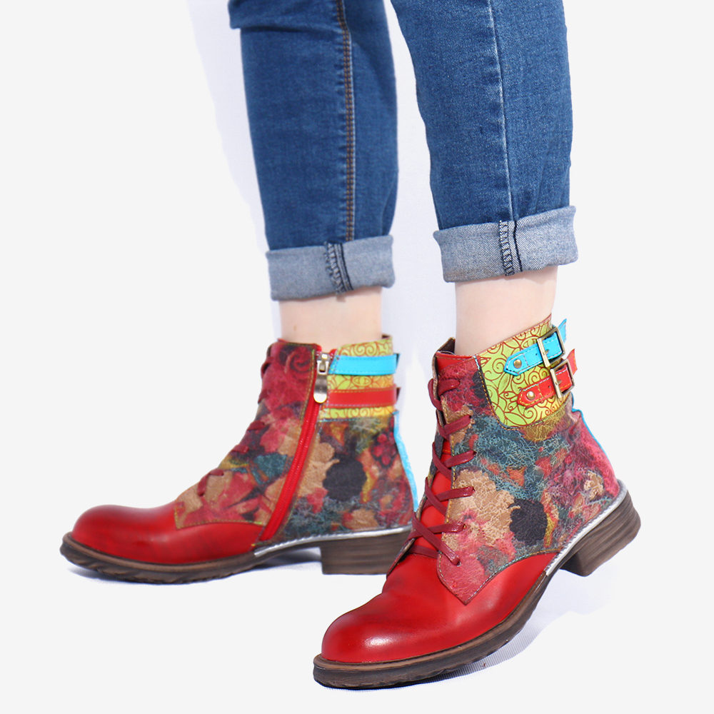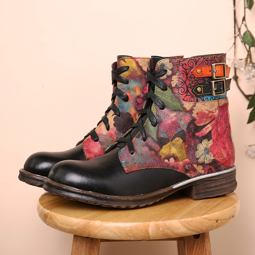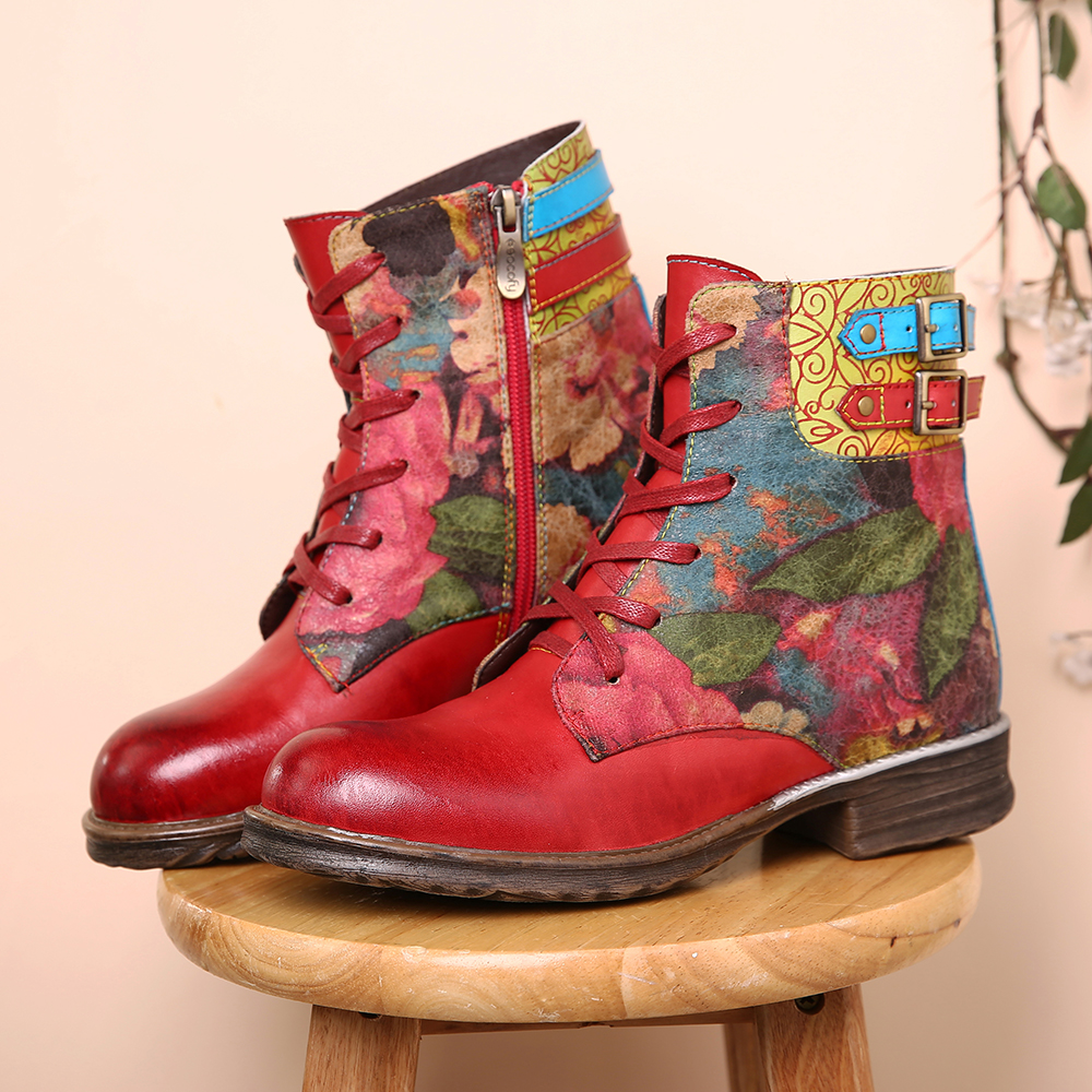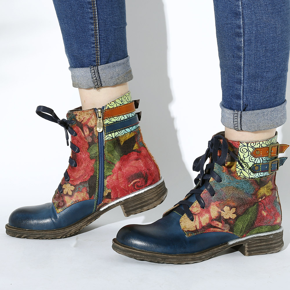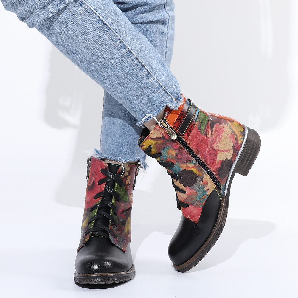 Womens Watercolor Rose Genuine Leather Zipper Lace Up Flat Boots