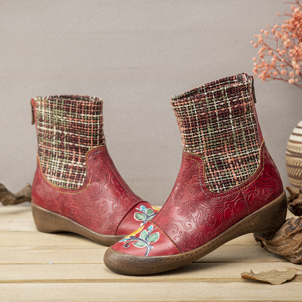 Check Woolen Splicing Floral Embossed Genuine Leather Flat Short Boots