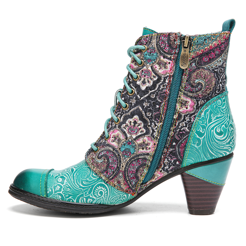 Socofy Genuine Leather Floral Pattern Retro Mid-calf Boots