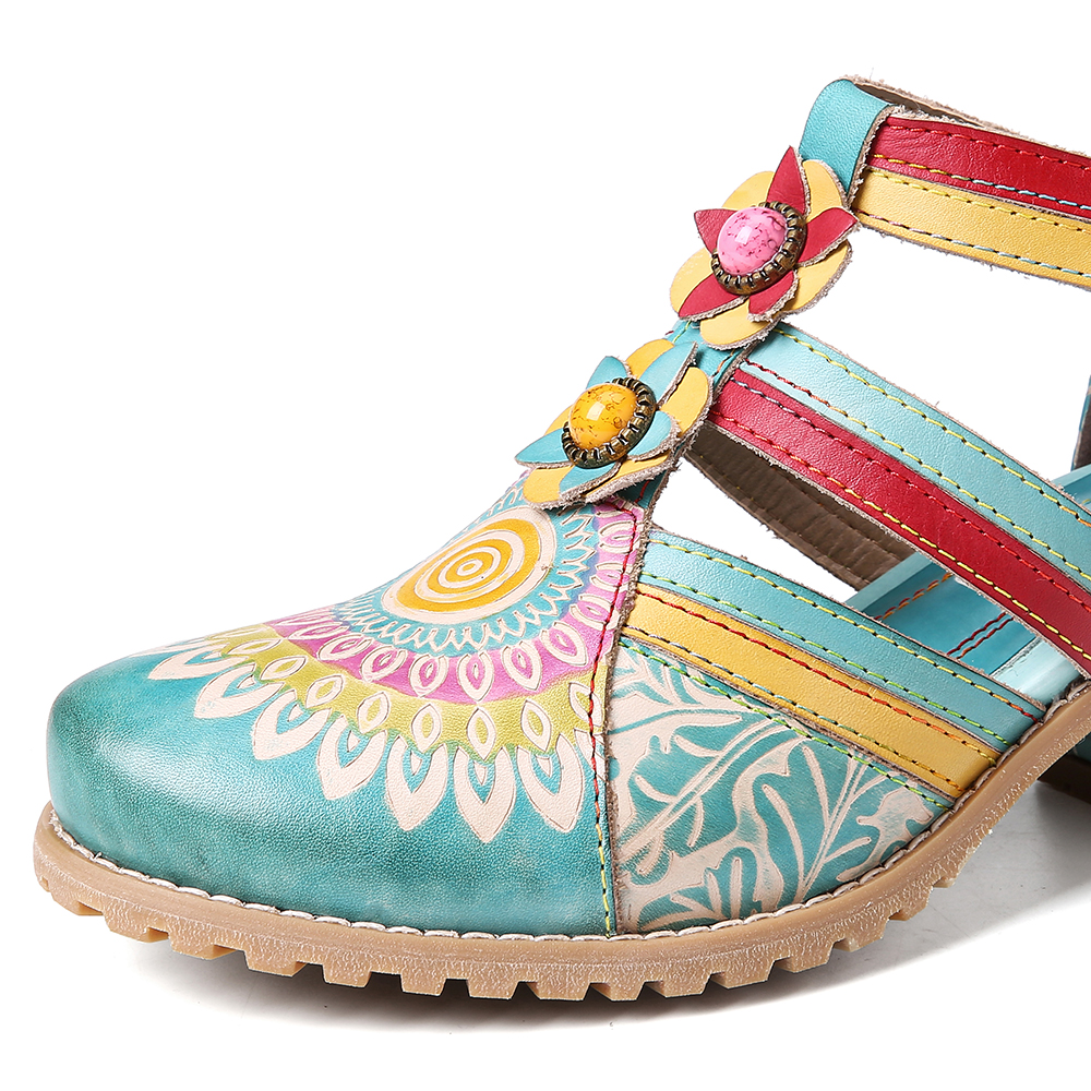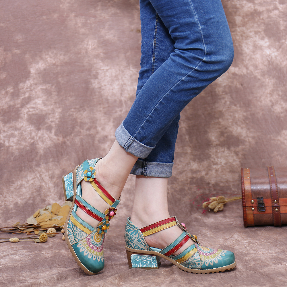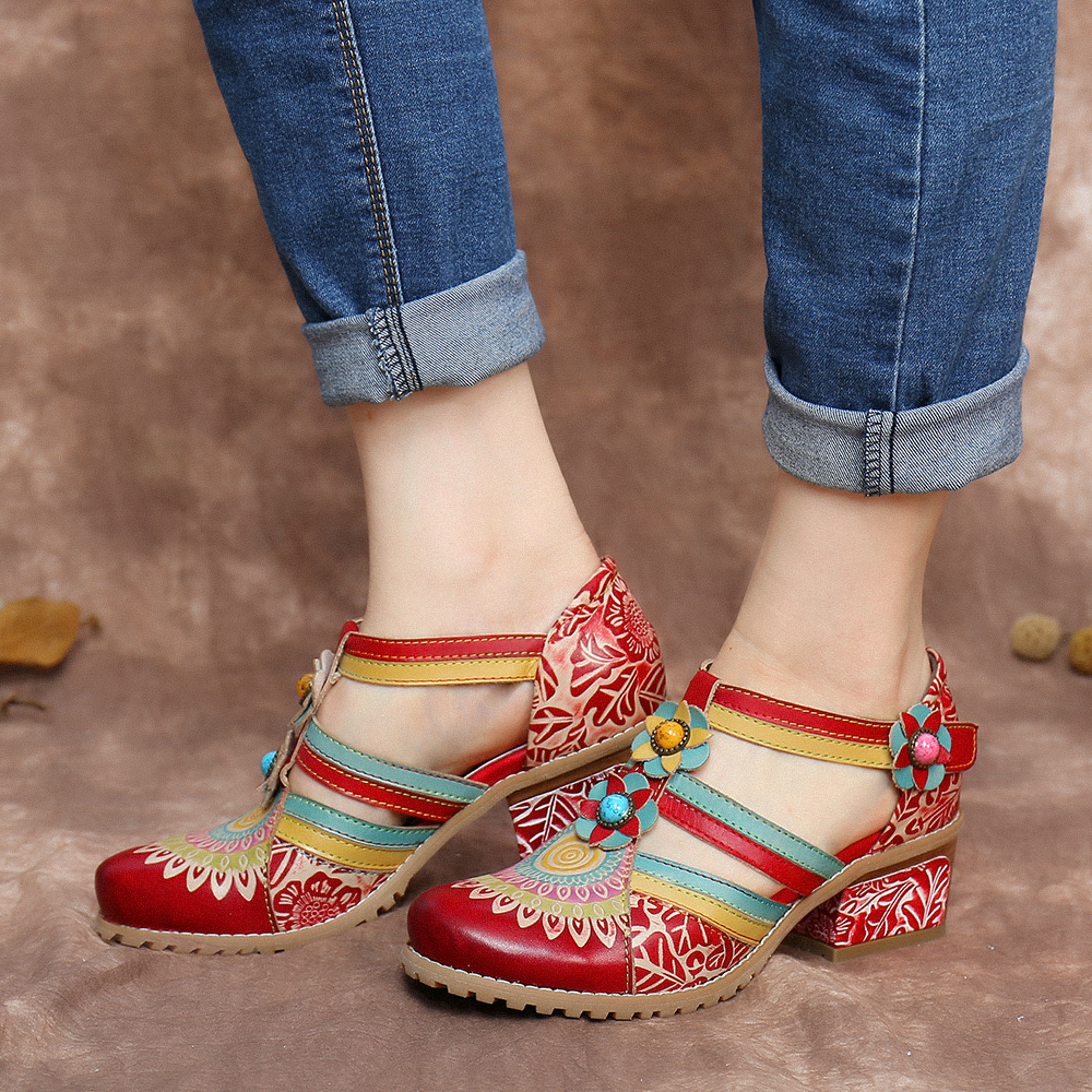 Bohemia Ethnic Style Stitching Embossed Beading Floral Chunky Heel Pumps