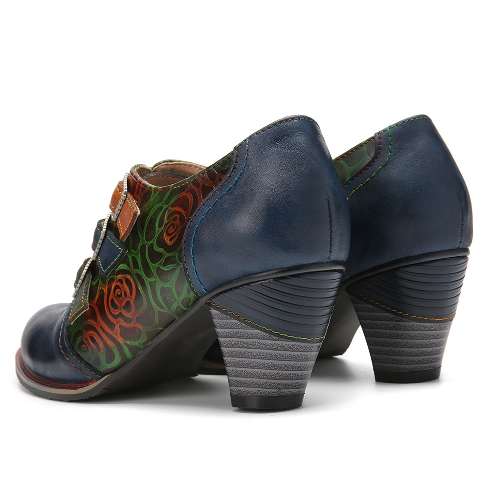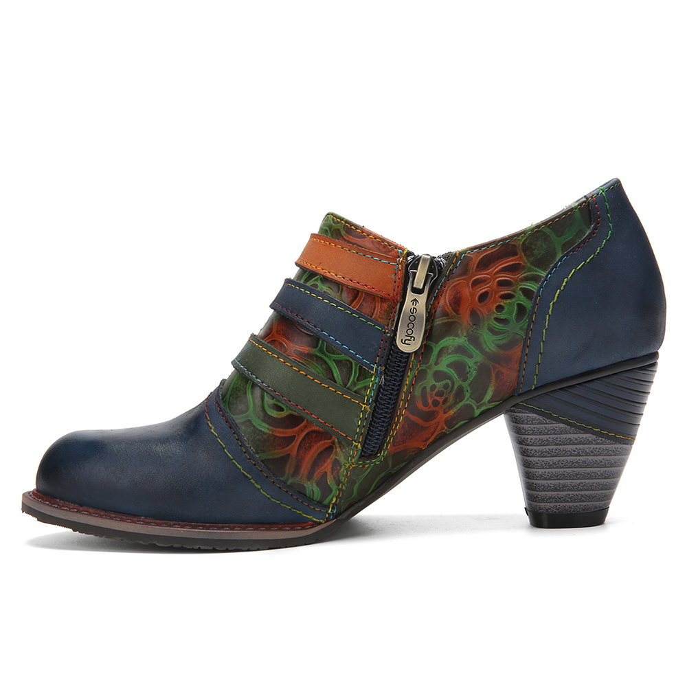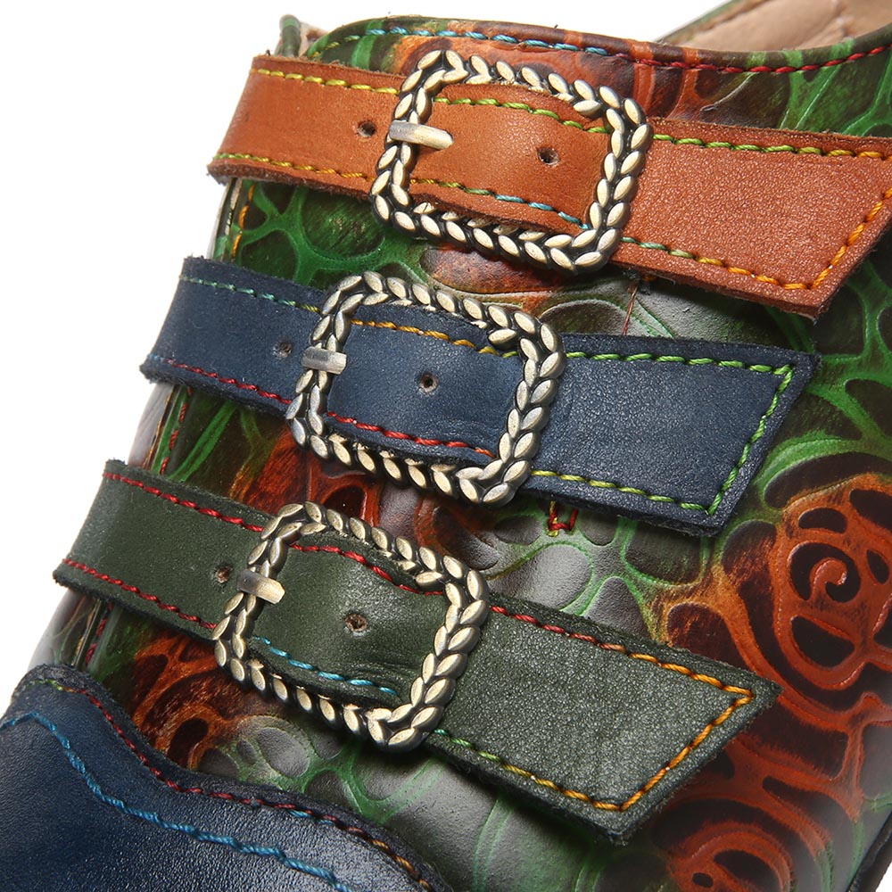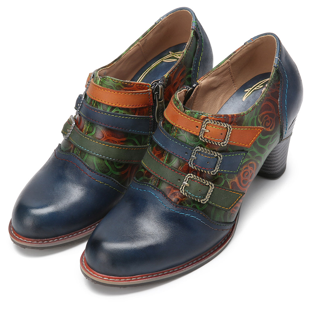Genuine Leather Comfy Side-zip Retro Belt Buckle Decor Floral Heels