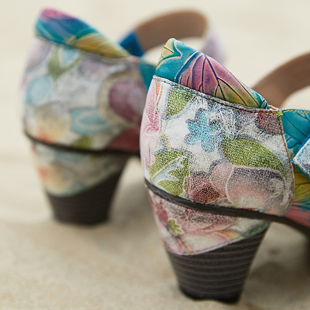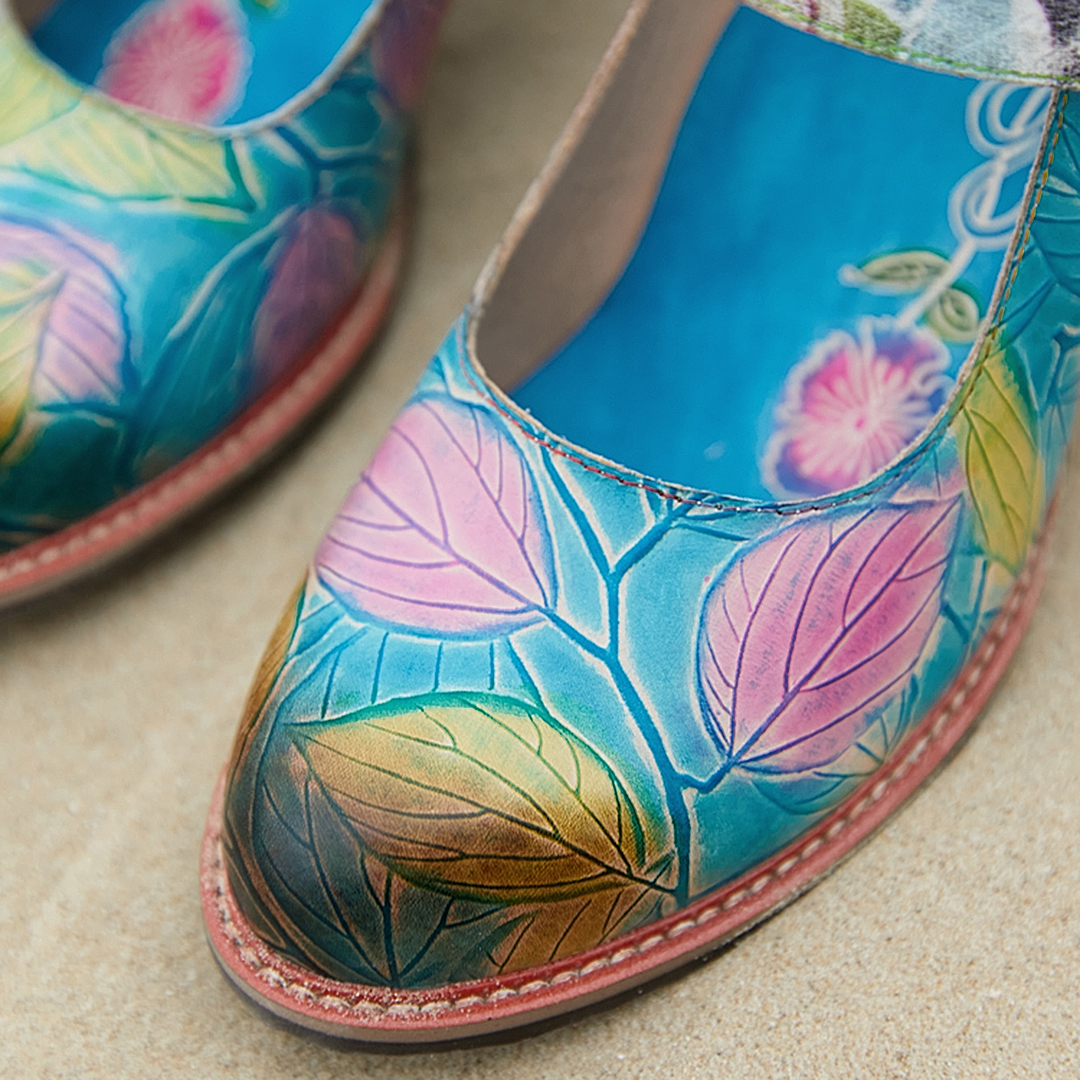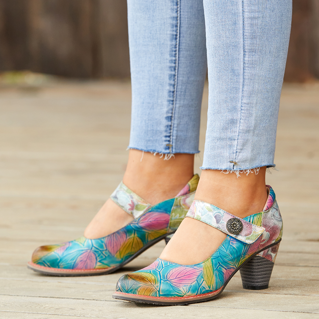 Genuine Leather Hook & Loop Leaf Painted Comfy Mary Jane Heels