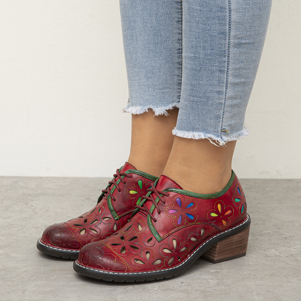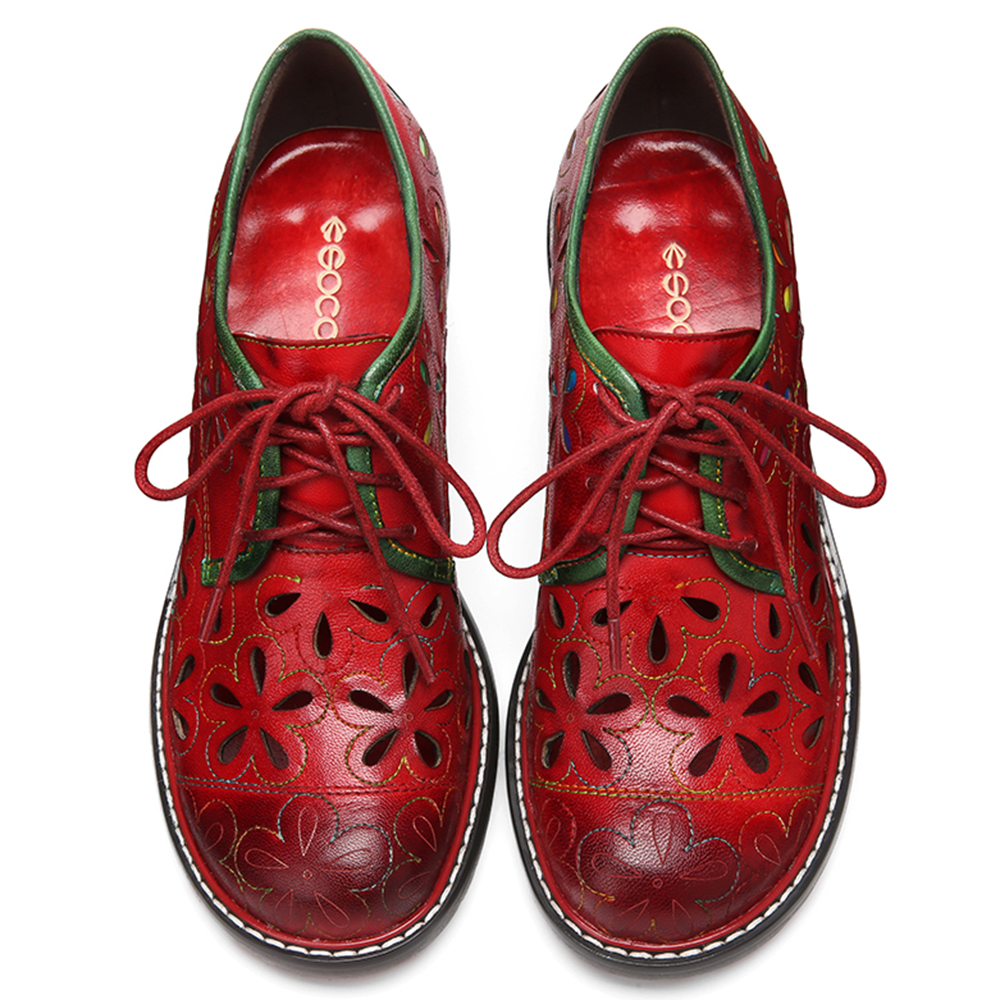Genuine Leather Retro Comfy Breathable Hollow Lace-up Low Heel Oxfords Shoes