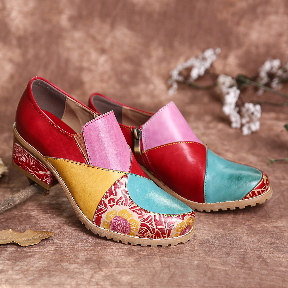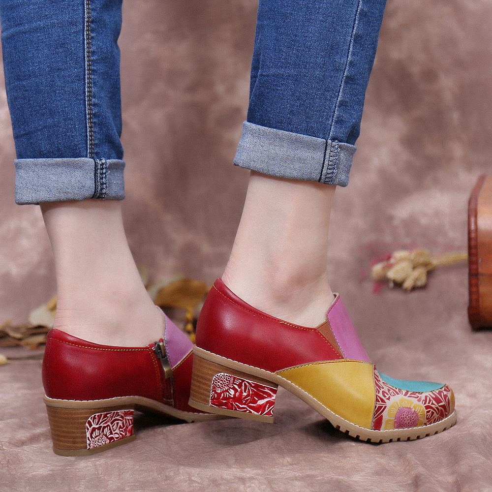 Retro Contrast Splicing Leather Zipper Low Heel Ankle Boots Slip On Block Heel Pumps
